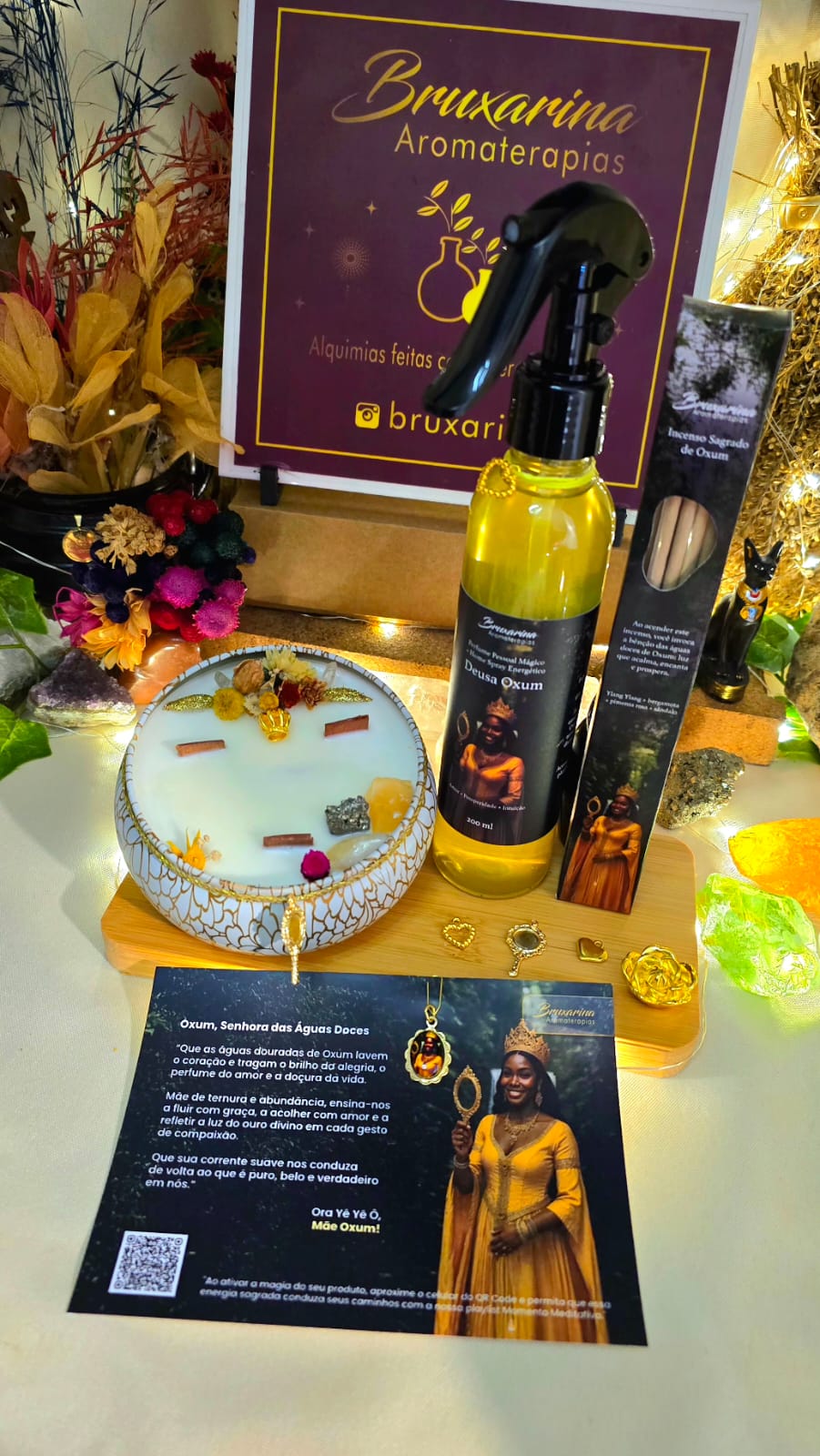 Cada elemento desta coleção foi consagrado na frequência dourada da deusa Oxum, com rituais de reiki, cromoterapia, florais de Saint Germain e sons em frequências elevadas.
