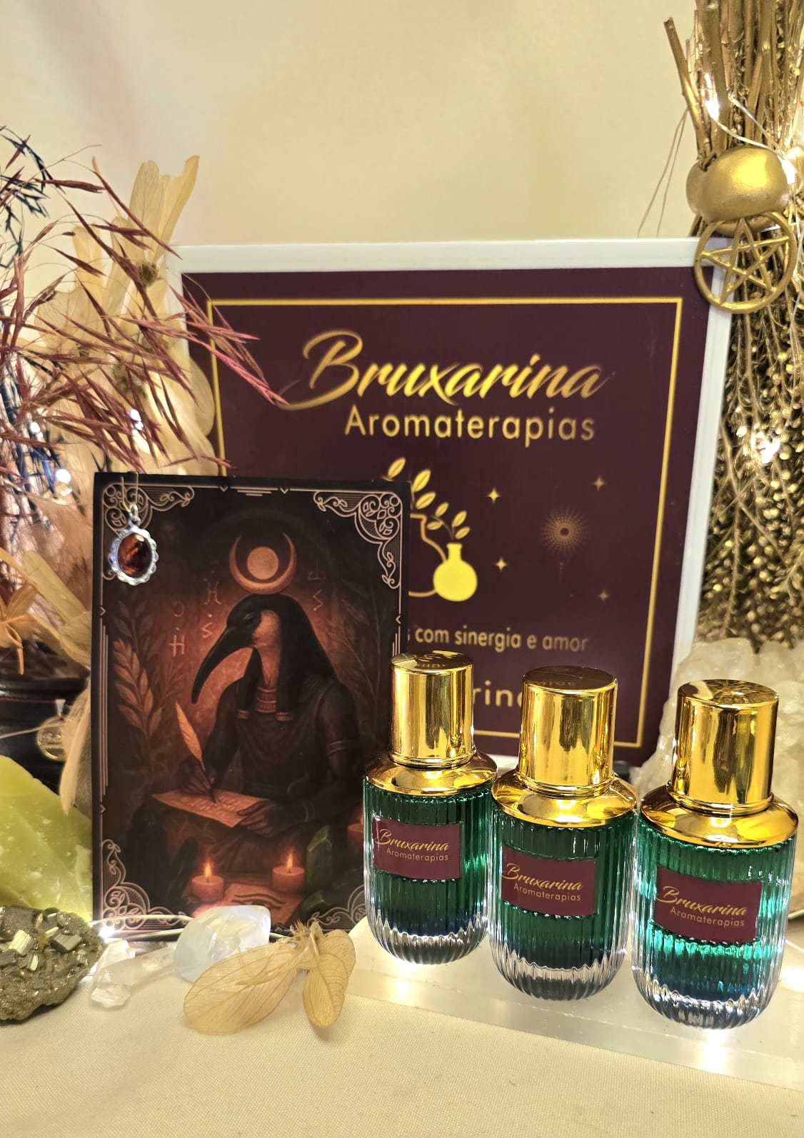 Todos os itens são consagrados com Reiki, florais e música 963 Hz, que conectam corpo, mente e alma à energia luminosa do deus Toth.